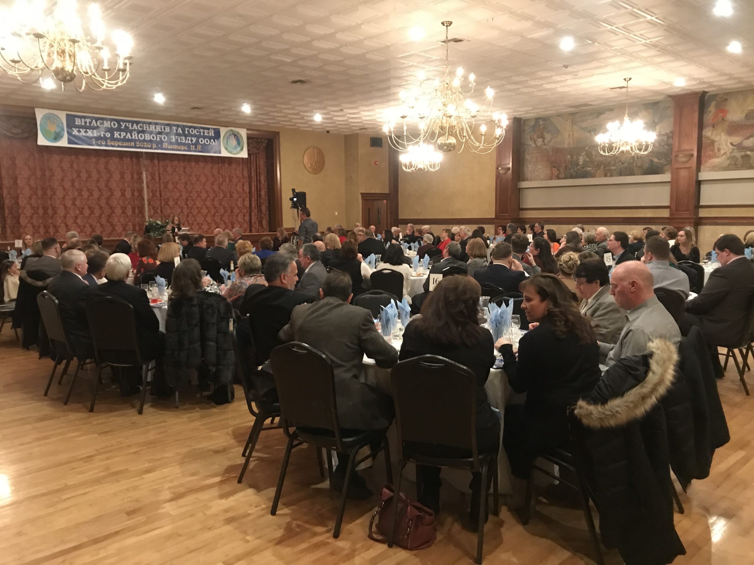 Opening the banquet were: Stefan Kapitula, head of the organizing committee; Oksana Tomaszewsky, who served as MC; Bishop Paul P. Chomnycky OSBM of the Ukrainian Catholic Eparchy of Stamford, who led the 180 attendees in a prayer; opera singer Stefan Szkafarowsky, who sang the American and Ukrainian national anthems; and Petro Kosciolek, who served as head of the National Congress Presidium and publicly announced the newly elected OOL Executive Board. Honored guests who also publicly offered congratulations included: Volodymyr Kravtsov, Vice Consul at the Consulate General of Ukraine in NYC; Ivan Jaworsky from the Organization for Defense of Four Freedoms of Ukraine; Yuriy Symczyk from the Ukrainian National Association; Roman Kozicky from SUMA Federal Credit Union; Michael Koziupa from Selfreliance Federal Credit Union; Helen Newmerzyckyj from Nova UA Federal Credit Union, as well as Zenko Halkowycz on behalf of Ukrainian National Federal Credit Union and Marie Duplak on behalf of the Ukrainian Congress Committee of America.