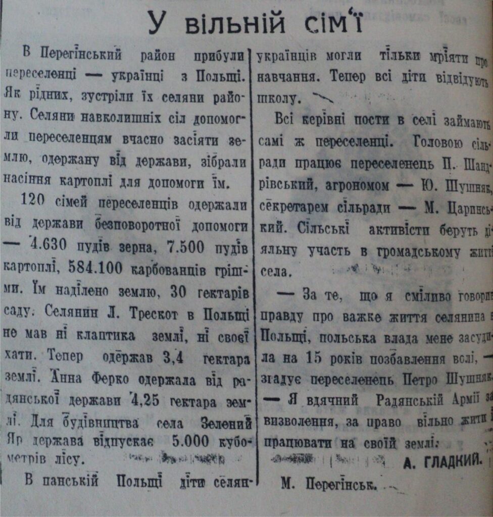 Ймовірно, через бойові дії, які вела в той час УПА, відразу по війні українцям із Польщі в західних областях УРСР оселятися не дозволяли. Газета “Прикарпатська правда”, зокрема, писала про 122 родини українців, що переселяються на постійне місце проживання аж до Херсонської області. “Здрастуй, Батьківщино!” — схвильовано кажуть люди, що прибули на землю своїх батьків”. Газета оминула увагою те, що батьки та діди цих переселенців — за сотні кілометрів, поховані у «польській» землі.