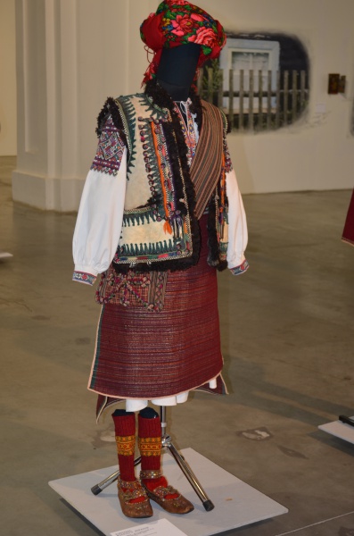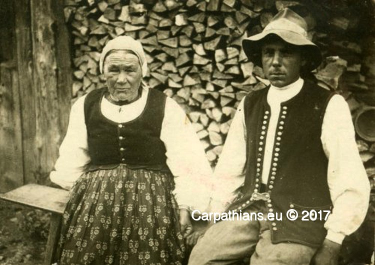 На верх носили суконі блакитного кольору або з чорного оксамиту вишиті світло червоними вовняними нитками (часто скручені з золотою ниткою) чи обшиті червоною тесьмою горсети (камізельки). На голові носили хустку, а заміжні жінки — очіпок. Взимку носили коротку гуньку, сердак або ще зверху білий, вишитий нитками і шкірою кожух, часто без рукавів. Кожух був довжиною нижче колін. На шиї носили пацьорки, що виглядали як комірчик. На ногах носили шкірні (черевики). На шиї носили коралі (пацьорки).
